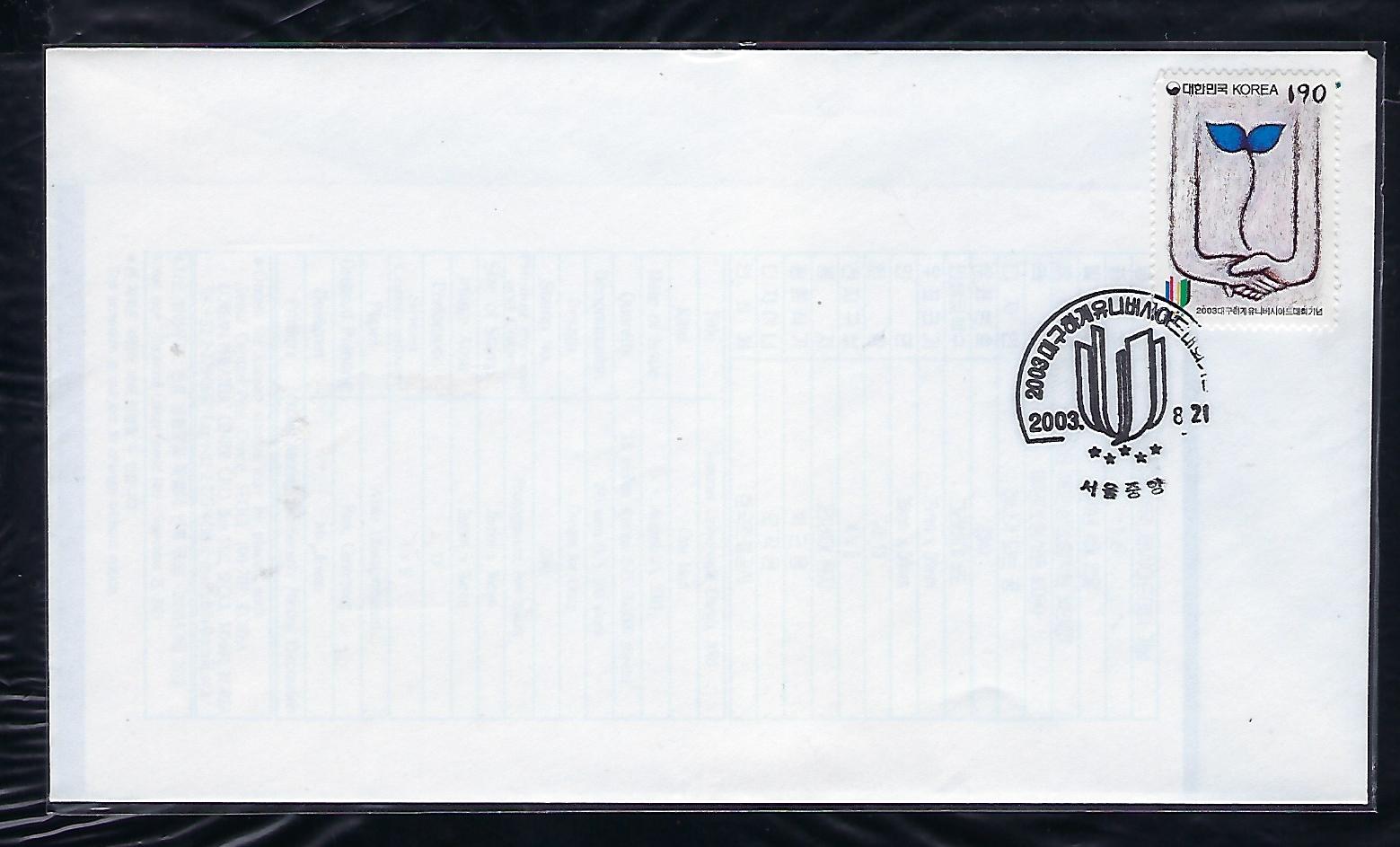 2003년 대구 하계 유니버시아드 대회 기념 우표 안내 카드 포함 초일 봉투(FDC)