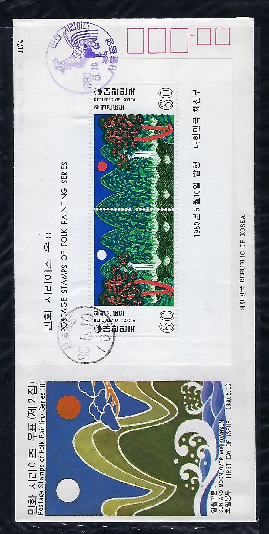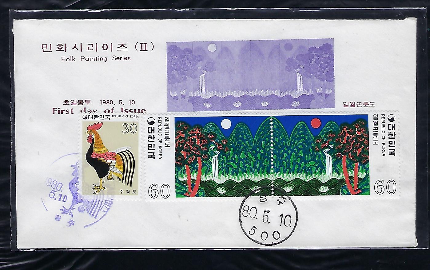 1980년 민화 시리즈 2 집 일월 곤륜도 시트 초일 봉투 (FDC) 안내 카드 포함