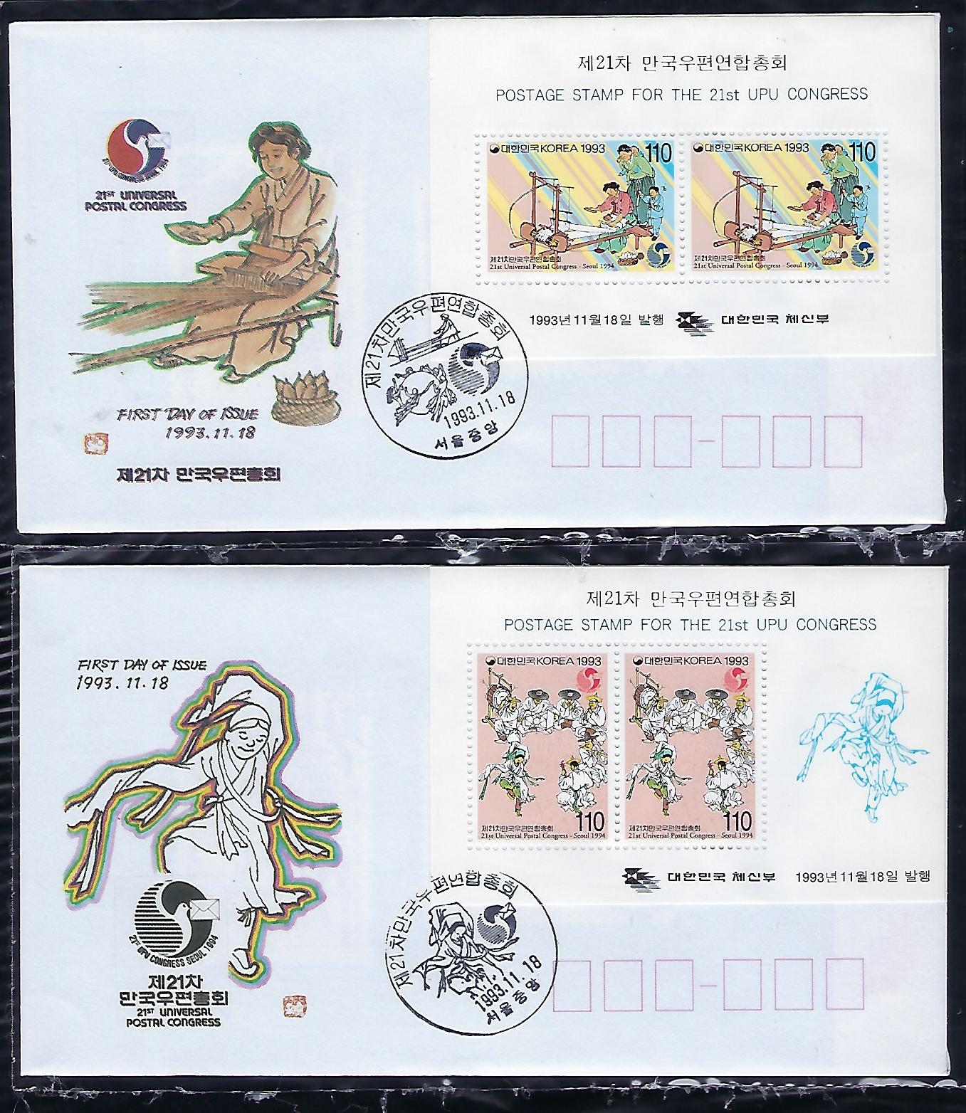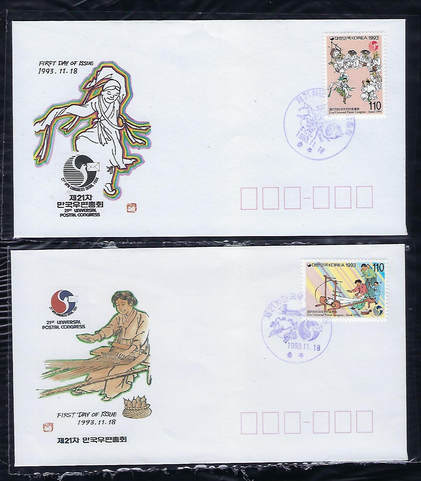 1993년 제 21차 만국 우편 연합 총회 우표 초일 봉투(FDC) 2완