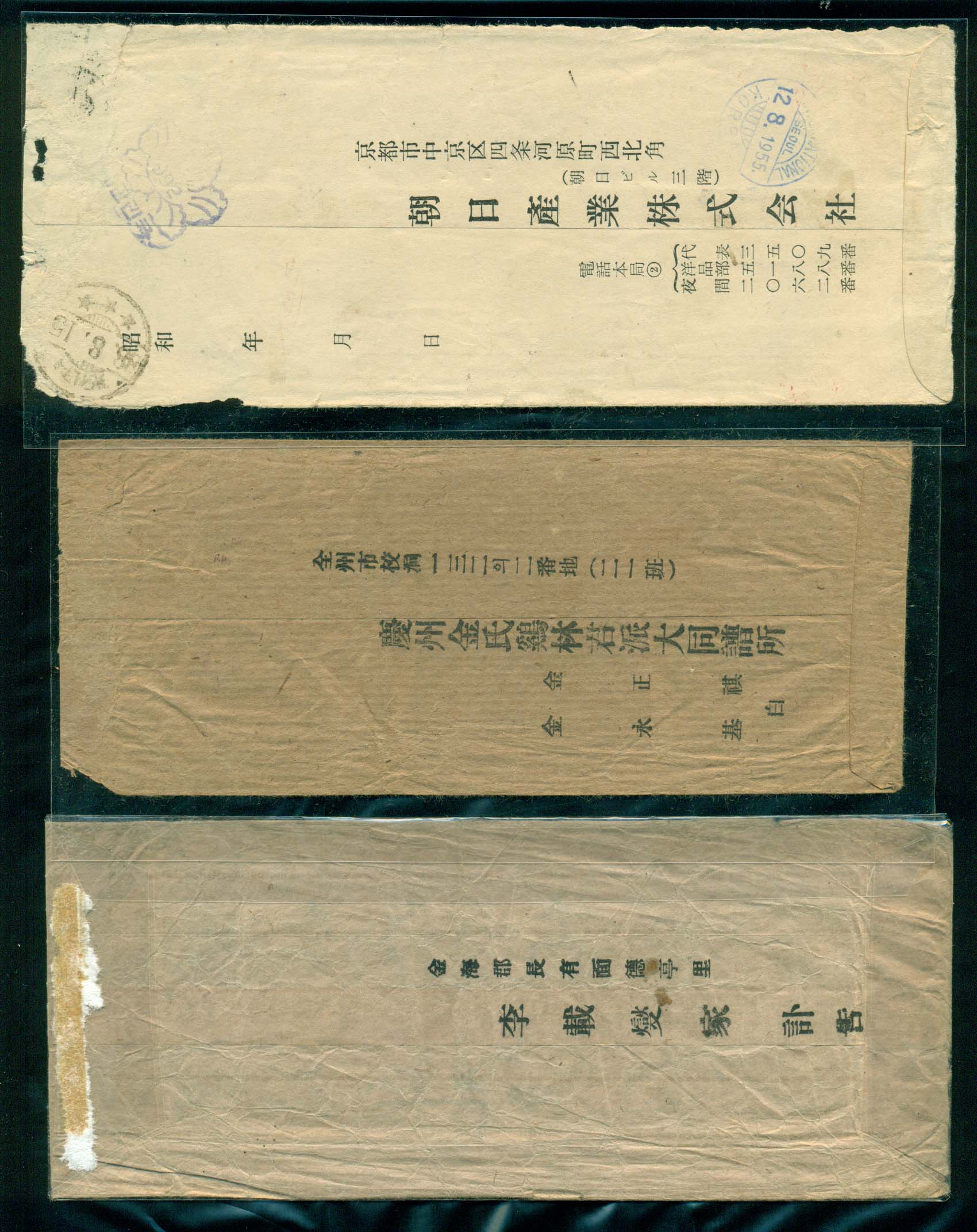 우표 탈락 1950 년대 실체봉피 3장
