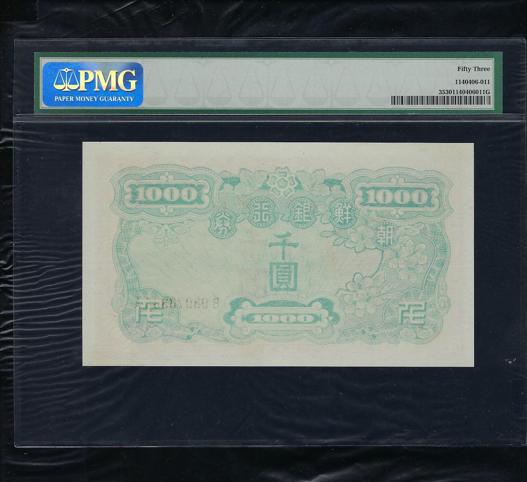 > 전체카테고리 > 우리나라 지폐 조선은행(미발행권) 신1000권으로 상태는 더 설명이 필요 없는 상위 준미사용품 PMG 53 등급입니다.