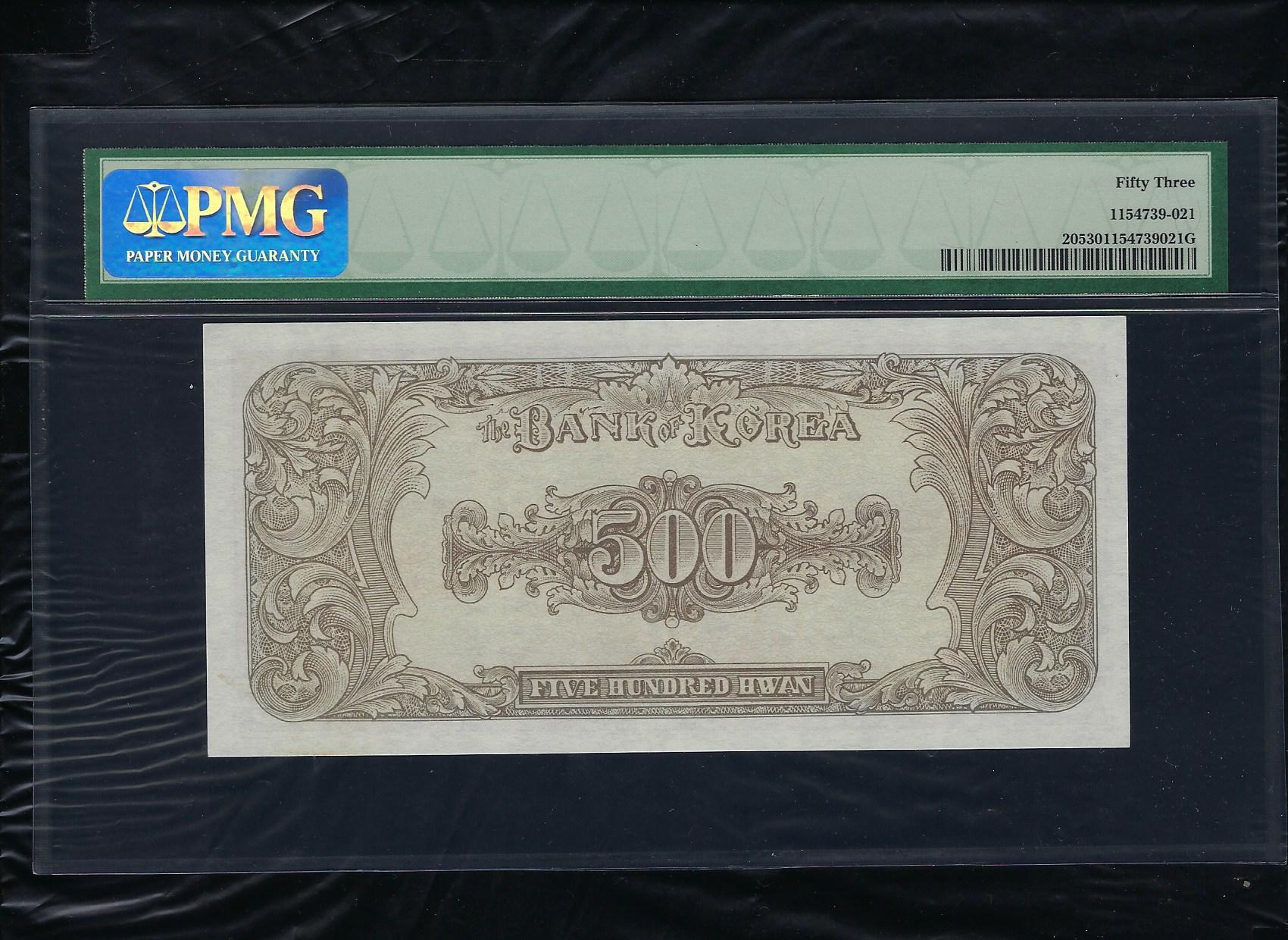 한국은행 500 환권 중앙이박 4289년으로 상태는 사진에서 보시는 봐와 같이 더 설명이 필요없는 상위 준미사용품 PMG 53 등급입니다.