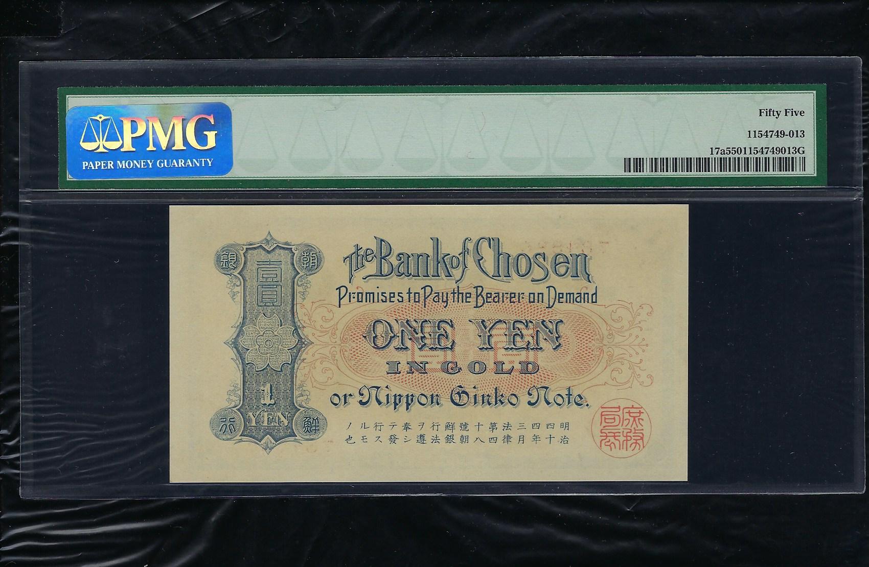 > 전체카테고리 > 우리나라 지폐 > 조선은행권 조선은행 1원권(금권) 조선총독부인쇄로 상태는 더 설명이 필요 없는 상위 준미사용품 PMG 55 등급입니다.