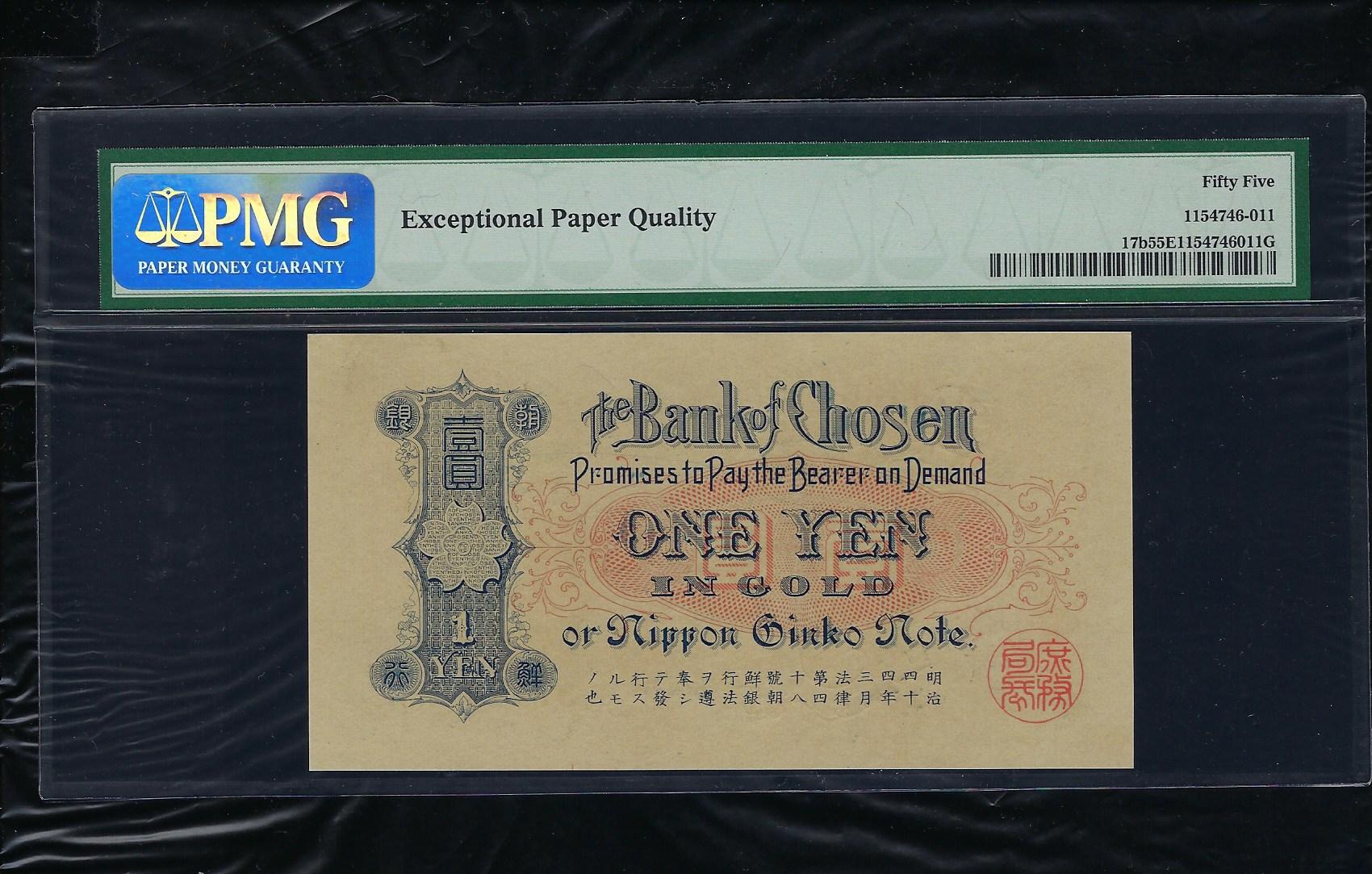 > 전체카테고리 > 우리나라 지폐 > 조선은행권 조선은행 1원권(금권) 내각인쇄국인쇄로 상태는 더 설명이 필요 없는 상위 준미사용품 PMG 55 등급입니다.