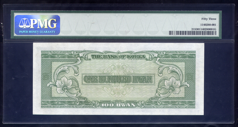 한국은행 개 100환권 초판(1)으로 상태는 사진에서 보시는 봐와 같이 더 설명이 필요 없는 상위 준미사용품 PMG