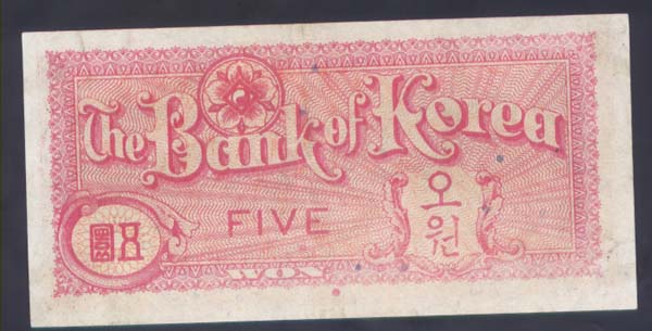 한국은행 5환권으로 상태 사진에서 보시는 봐와 같이 +극미품정도입니다 . 참고로 최근 발간된 한국화폐도록