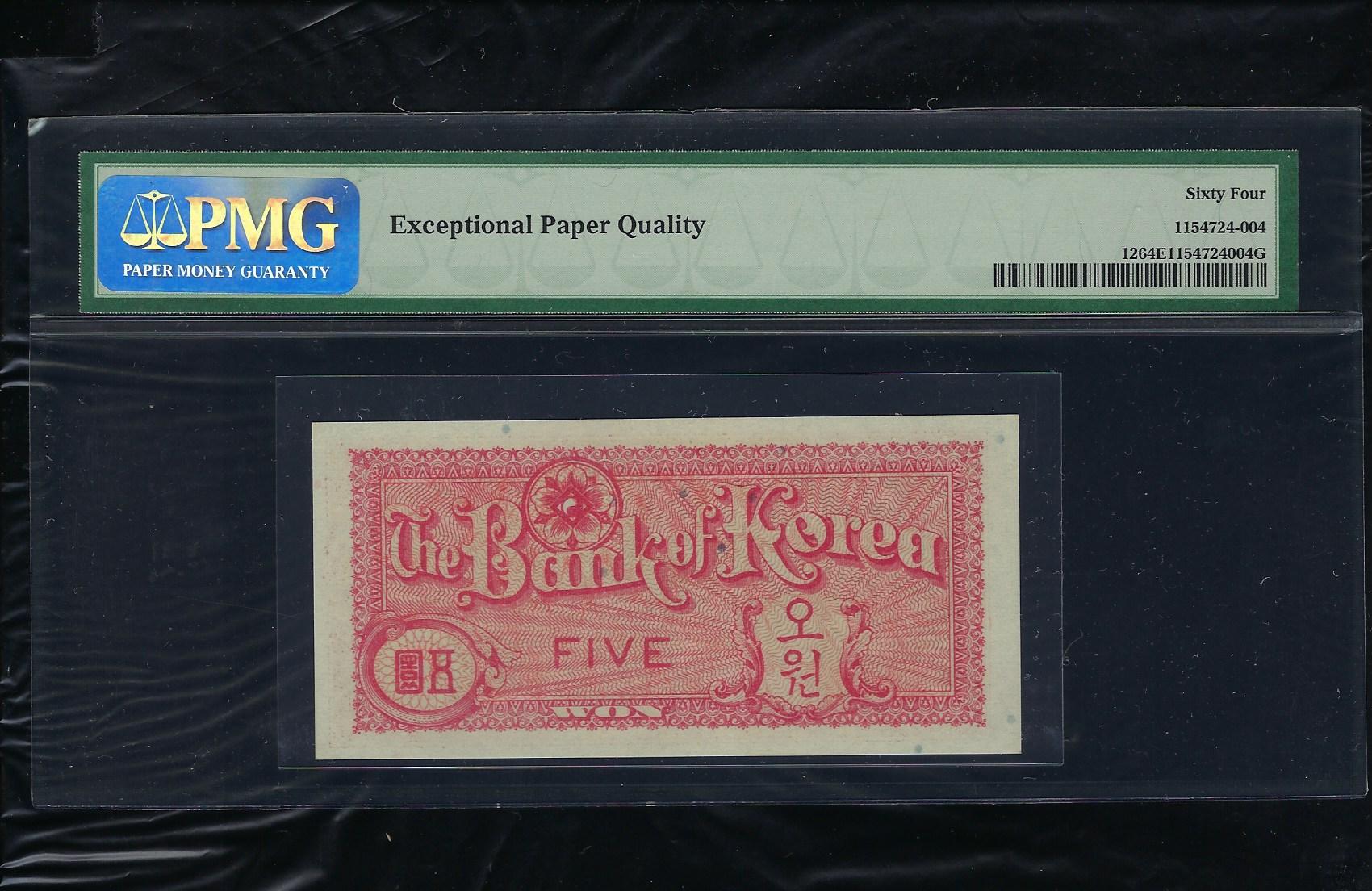 > 전체카테고리 > 우리나라 지폐 > 한국은행권 한국은행 5환권 거북선으로 상태는 사진에서 보시는 봐와 같이 더 설명이 필요 없는 최 상위 미사용품 PMG 64등급입니다.