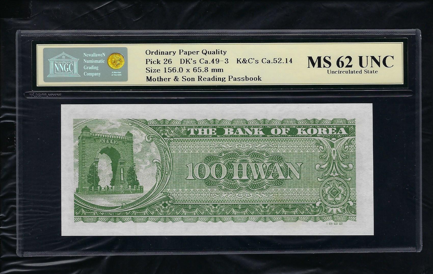 > 전체카테고리 > 우리나라 지폐 > 한국은행권 > 한국은행 개 갑 100환권 모자상 한국은행 개 갑 100 환권 모자상 NNGC MS 62 UNC 미사용품등급으로 상태는 사진에서 보시는 봐와 같이 더 설명이 필요 없는 미사용품 NNGC MS 62 UNC 등급입니다.