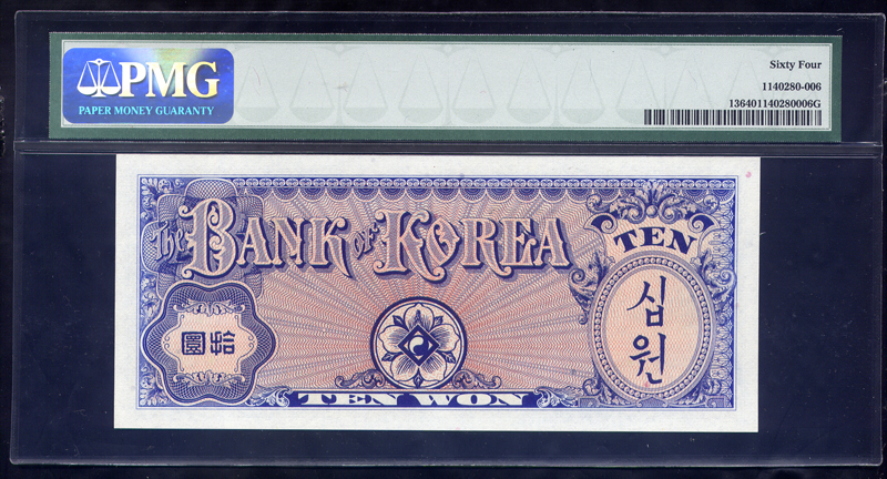 > 전체카테고리 > 우리나라 지폐 > 한국은행권 > 한국은행 10환권 거북선 한국은행 10환권 (거북선)원권으로 상태는 사진에서 보시는 봐와 같이 더 설명이 필요 없는 최상위 미사용품 PMG 64 등급입니다.