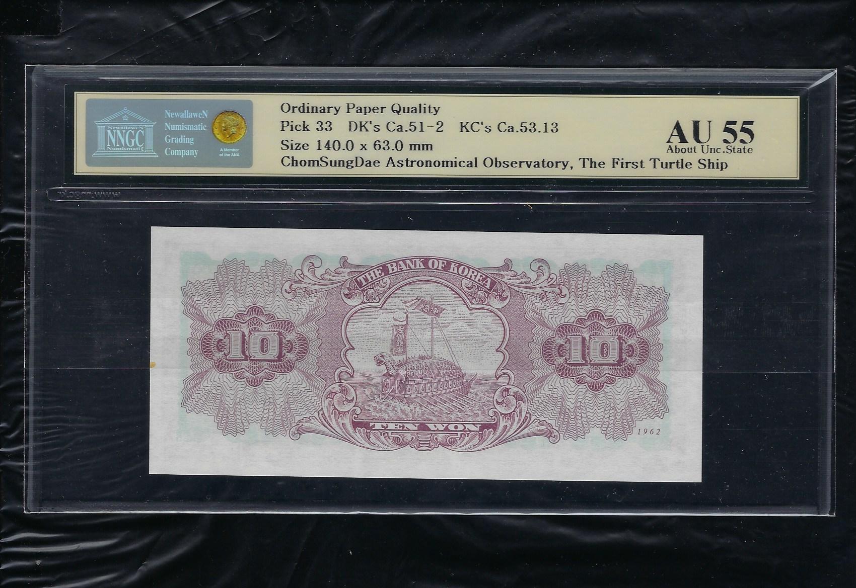 한국은행 나10 원권 1962년 15판으로 상태는 사진에서 보시는 봐와 같이 더 설명이 필요없는  상위 준미사용품 NNGC AU 55 등급입니다.