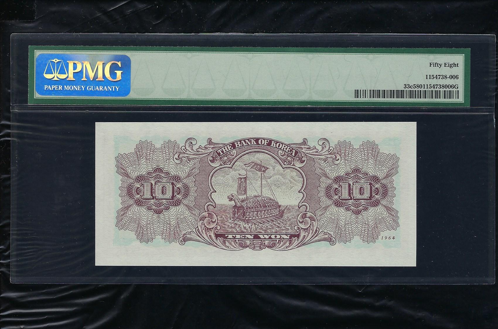 한국은행 나 10 원권 1964년 제36판으로 상태는 사진에서 보시는 봐와 같이 더 설명이 필요없는 최 상위 준미사용품 PMG 58  등급입니다.