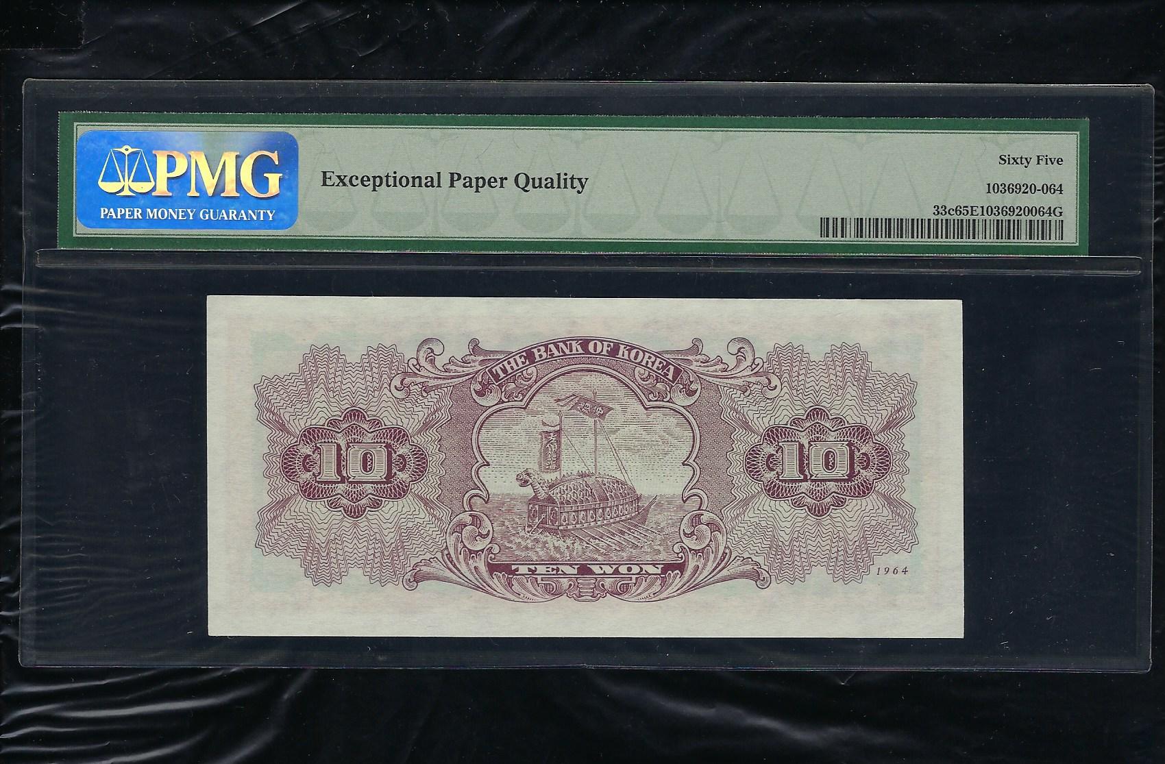 한국은행 나 10 원권 1964년 제37판으로 상태는 사진에서 보시는 봐와 같이 더 설명이 필요없는 완전미사용품 PMG 65 EPQ 등급입니다.
