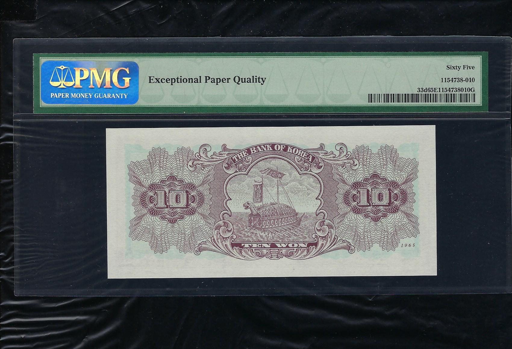 한국은행 나 10 원권 1965년 제75판으로 상태는 사진에서 보시는 봐와 같이 더 설명이 필요없는 완전미사용품 PMG 65 EPQ 등급입니다.