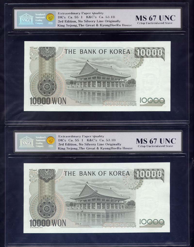 한국화폐도록 평가금액은 미사용품이 100,000원입니다만 완미 MS 67등급은 훨씬 더 높은 가격에 거래됩니다.