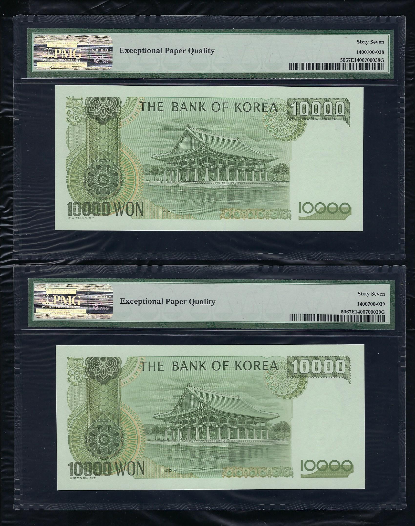참고로 한국화폐도록 평가금액은 미사용품이 50,000원입니다만 상위 완전미사용품 PMG 67 등급은 훨씬 더 높은 가격에 거래됩니다.