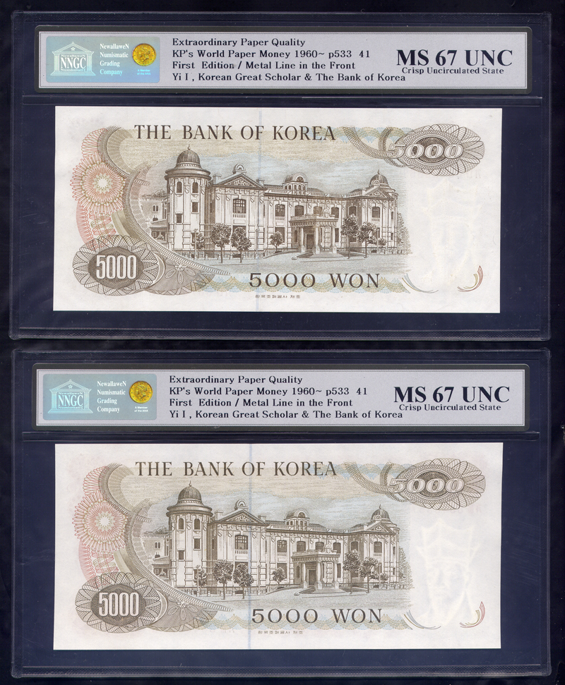 한국화폐도록 평가금액은 미사용품이 700,000원입니다만 완미 MS 67 등급은 훨씬 더 높은 가격에 거래됩니다.