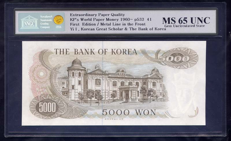 > 전체카테고리 > 우리나라 지폐 > 한국은행현행권 > 가5000원권(1차) 한국은행 1차 가 5000원권으로 상태는 사진에서 보시는 봐와 같이 더 설명이 필요 없는 완전미사용품 MS 65 등급입니다.