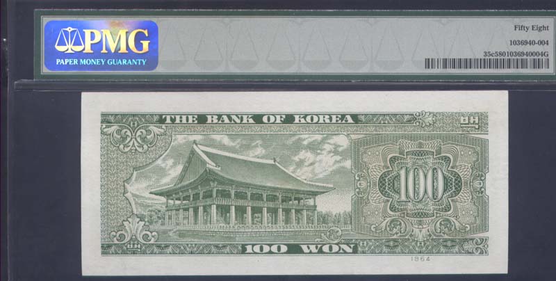 > 전체카테고리 > 우리나라 지폐 > 한국은행현행권 > 나100원권(경회루) 한국은행 나100 원권 경회루 1964년으로 상태는 사진에서 보시는 봐와 같이 더 설명이 필요없는 PMG 58 등급입니다.