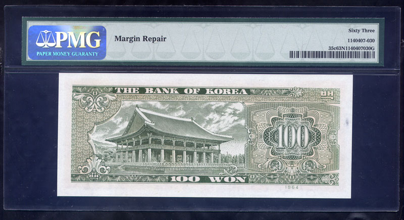지폐 가격에 그레이딩 비용이 약 40,000원을 더해서 생각해주십시요. PMG60-64 등급이 미사용품이이므로 상위 등급 미사용품입니다만 지폐만 보면 완전미사용품입니다. 전혀 흠이 없음에도 등급이 낮게 나왔습니다.