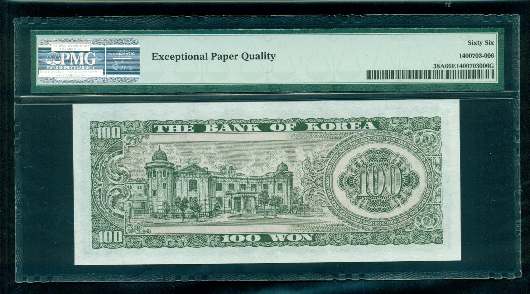 참고로 한국화폐도록 평가금액은 미사용품이 110,000원입니다만 상위 완전 미사용품 PMG 66 EPQ 등급은 훨씬 더 높은