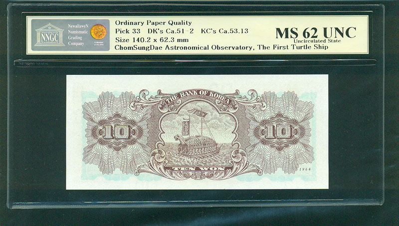 한국은행 나 10 원권 1964년 제53판 NNGC MS 62 UNC