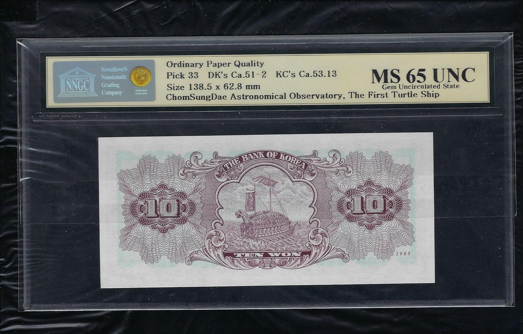 한국은행 나 10 원권 1965년 79판으로 상태는 사진에서 보시는 봐와 같이 더 설명이 필요없는 상위 완전미사용품 NNGC MS 65 UNC등급입니다.