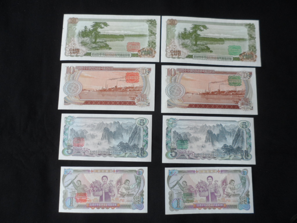 북한지폐 외화와 바꾼돈 50.10.5.1원 적색 청색 8종 미사용품