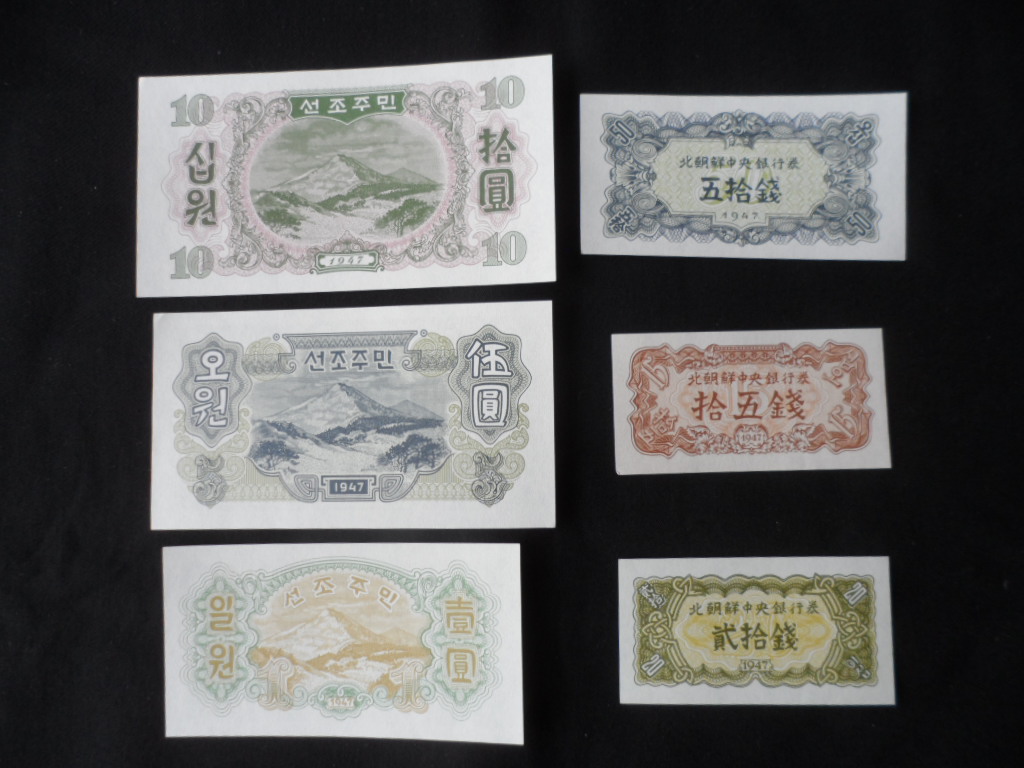 북한지폐 47년 10.5.1원50.20.15전 6종set 미사용품