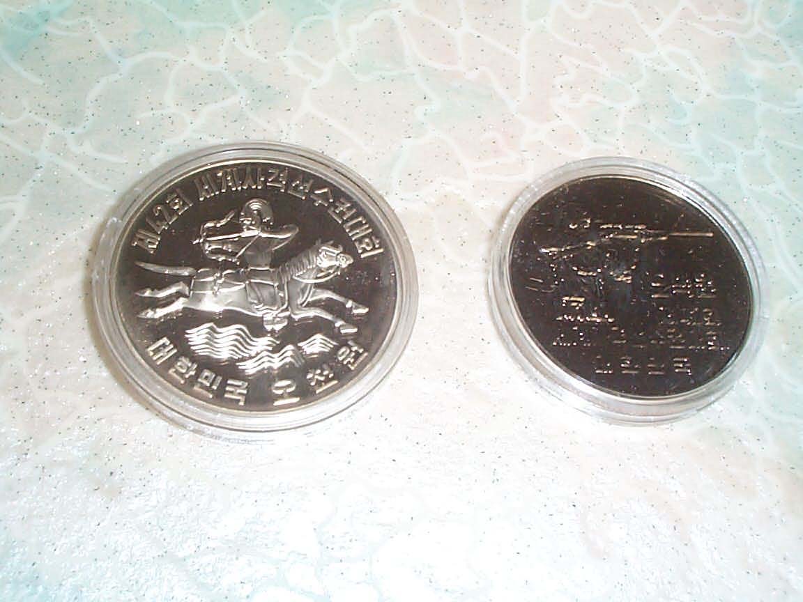 > 전체카테고리 > 주화 제42회 사격 선수권 대회 무광+유광 프루프화 2종set로 무광 5,000원화(은 95% 구리5%, 무게 23g 지름 35mm) 유광