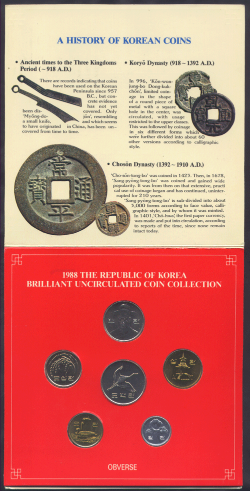 > 전체카테고리 > 주화 1988년 현행주화 6종 set(한국은행발행 정품,홍보용,증정용)입니다. 가격이 계속 오르고있는 인기 품목입니다.