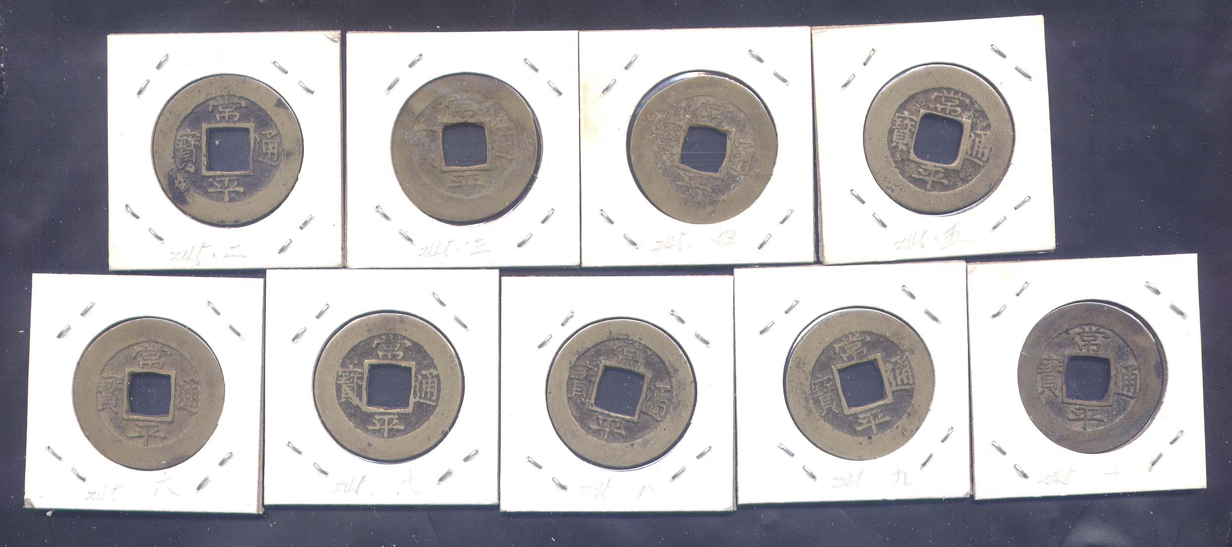 > 전체카테고리 > 주화 > All 常平通寶當 當一錢 背 `憁`下 `數字順` 右; 日票 大形 9종(,二,三,四,五,六,七,八,九,十)으로 상태는 사진과 같이 아주 좋습니다