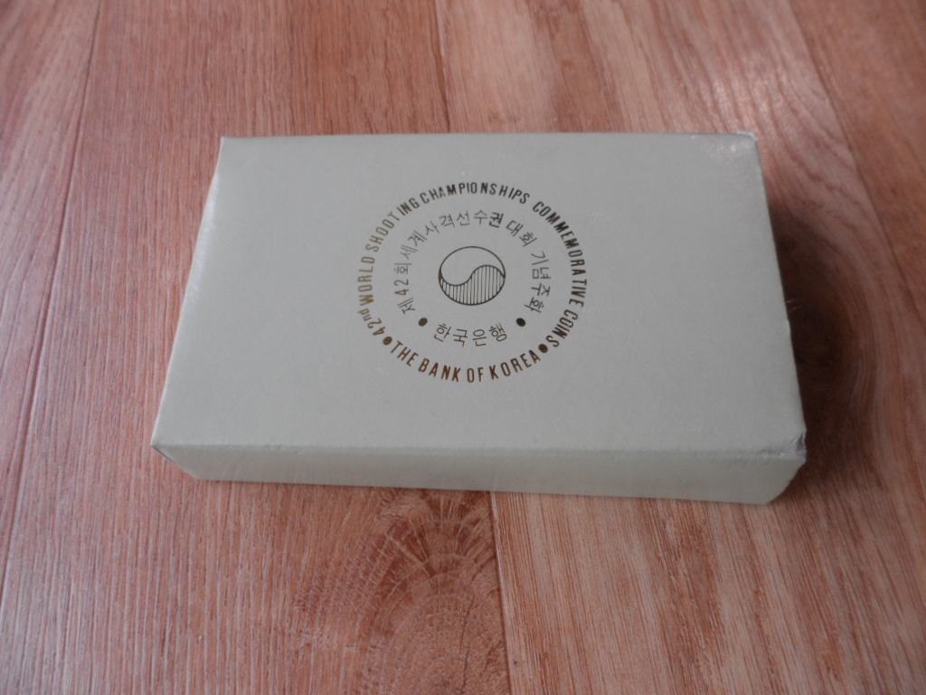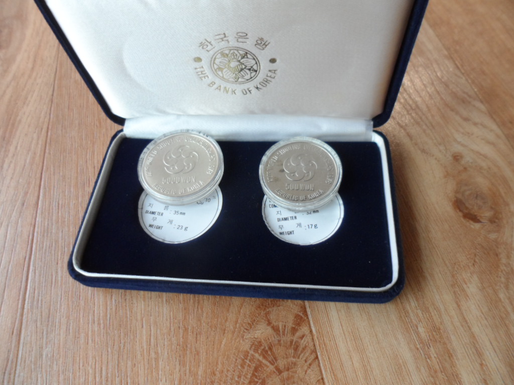 > 전체카테고리 > 주화 > 기념주화 제42회 사격 선수권 대회 유광 프루프화 2종set로 유광 5,000원화(은 95% 구리5%, 무게 23g 지름 35mm) 유광 500원화(구리 75% 니켈25% 지름32mm)로 아주 귀한 유광 프루푸화입니다.