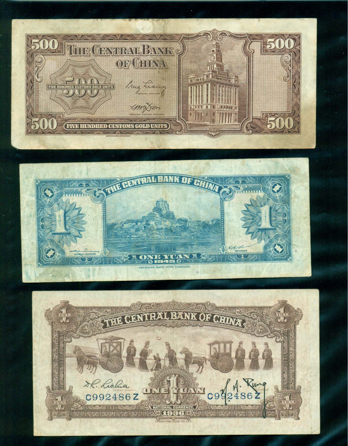 中央銀行 500,1,1원권 中華民國三十六,二十五,1945年 3장
