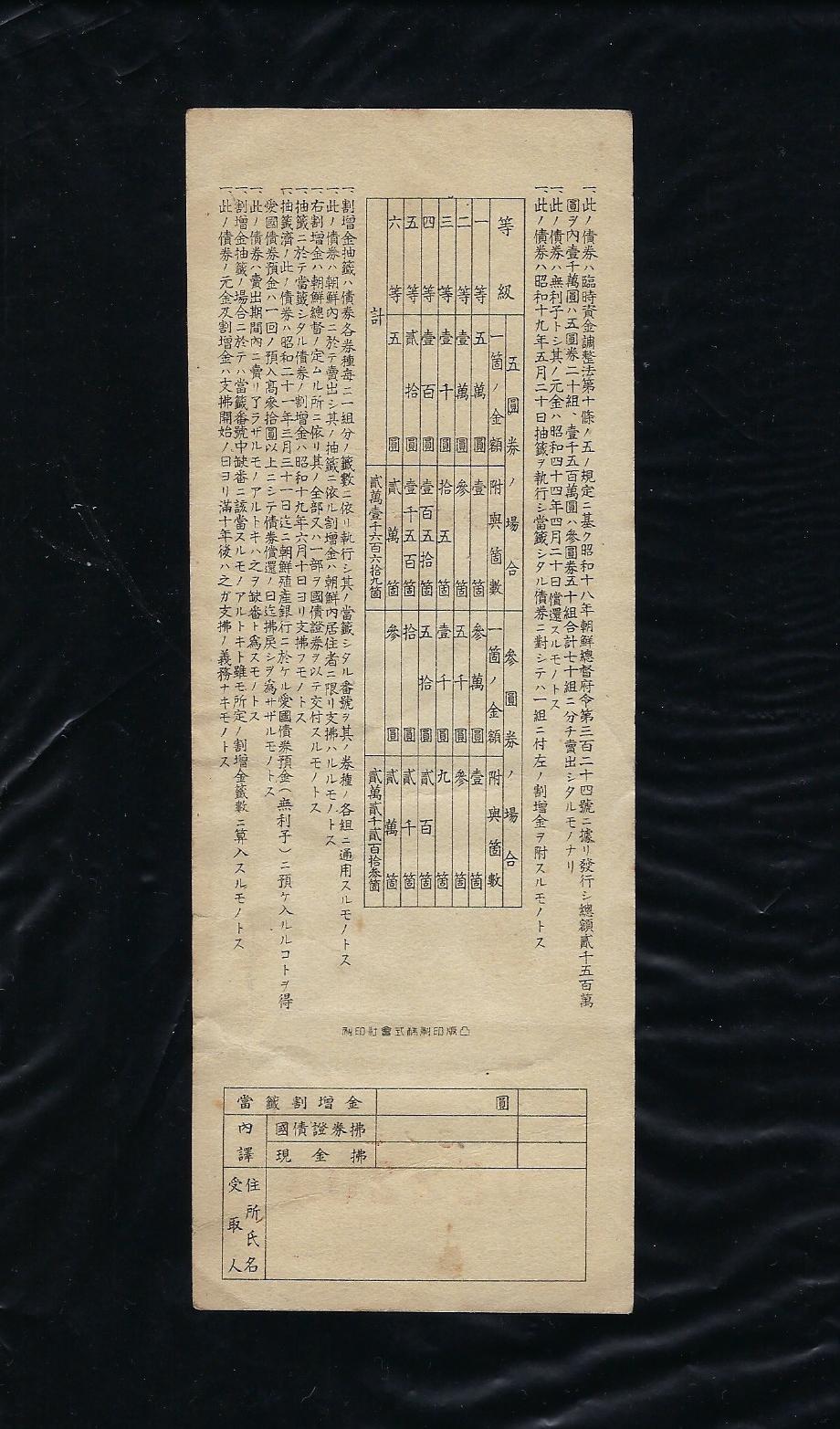 1944년 금5원 애국 채권으로 상태 사진과같이 양호합니다.