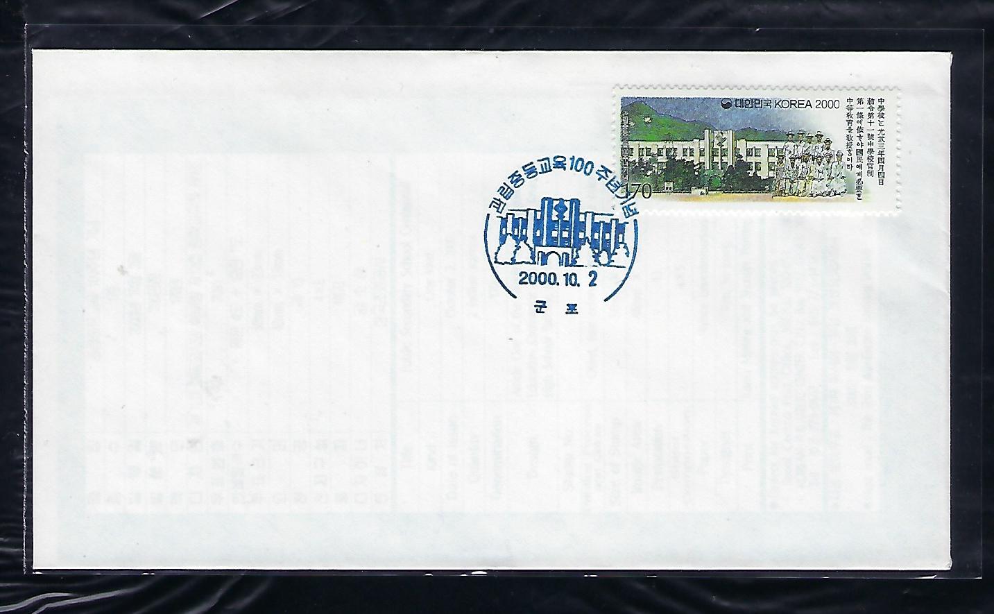 2000년 관립 중등 교육 100주년 기념 우표 안내 카드 포함 초일 봉투(FDC)