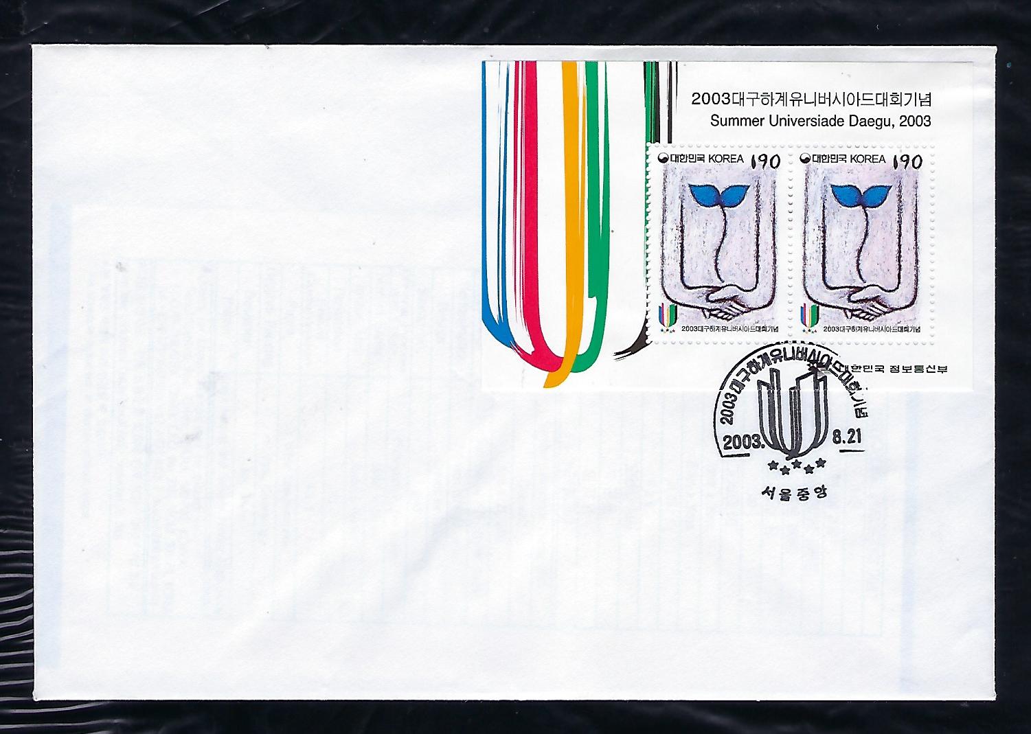 2003년 대구 하계 유니버시아드 대회 기념 시트 우표 안내 카드 포함 초일 봉투(FDC)