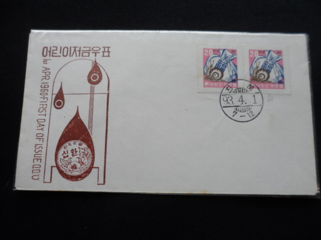 어린이저금 보통`환`화 우정마크투문용지 달팽이와 복주머니 초일봉투(F.D.C)