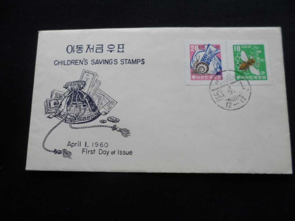 어린이저금 보통`환`화 우정마크투문용지 벌과 벌집 달팽이와 복주머니 초일봉투(F.D.C)
