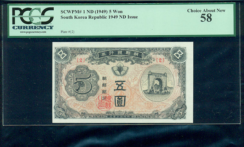 조선은행 신 5 원 초판 1번 독립문 PCGS 55