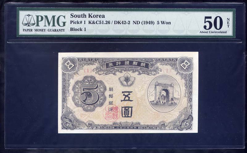 조선은행 신 5원권(독립문) 초판 1번 PMG 50
