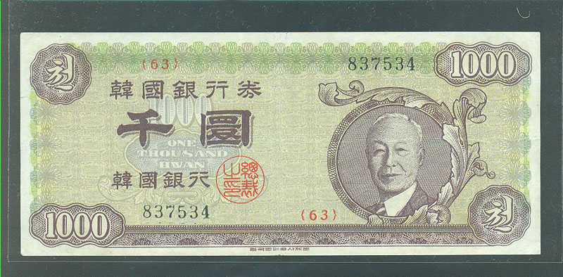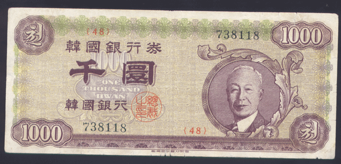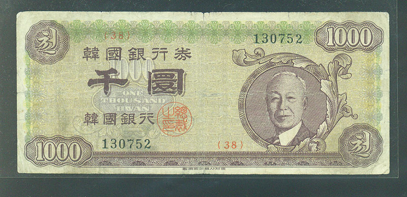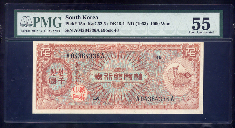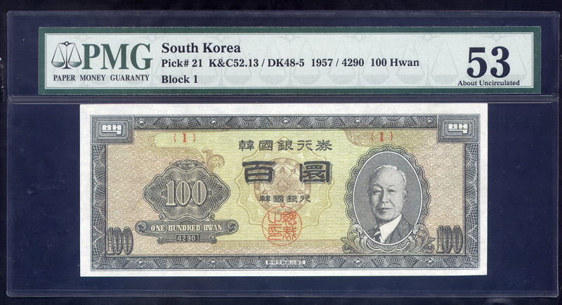 한국은행 신 100환권 황색지 초판 1번 PMG 25