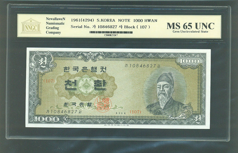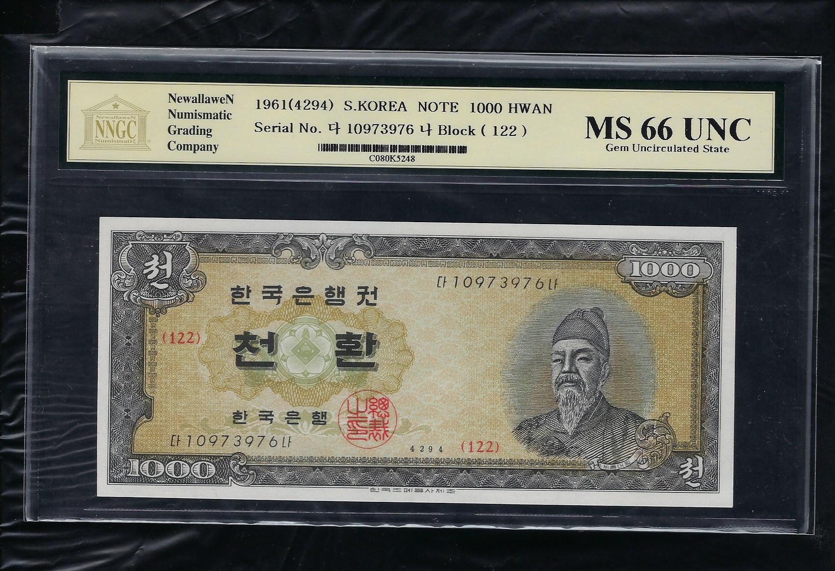 한국은행 개1000 환권 세종 4294년 NNGC MS 66 UNC