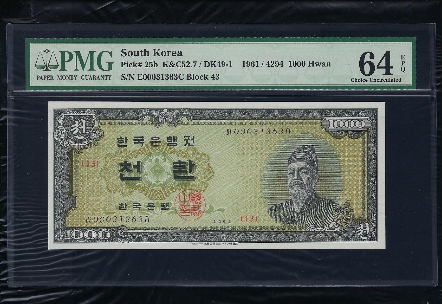 한국은행 개 1000 환권 4294년 제43 판 PMG 64 EPQ