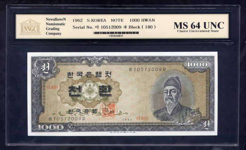 한국은행 개 1000 환권 1962년 NNGC MS 64 UNC