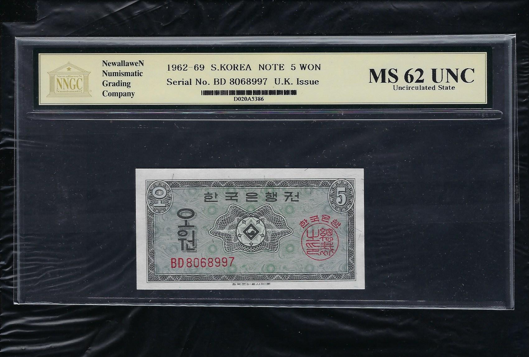 한국은행 5원권 BD기호 영제 NNGC MS 62 UNC