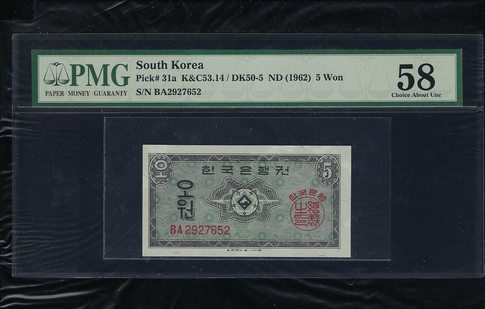 한국은행 5원권 BA 기호 초판 영제 PMG 58