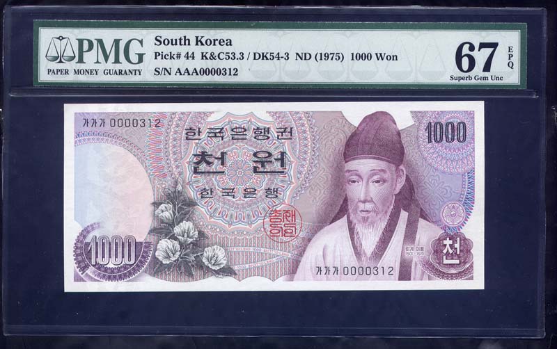 한국은행 가 1000 원권 빠른번호 가가가 0000312번 PMG 67