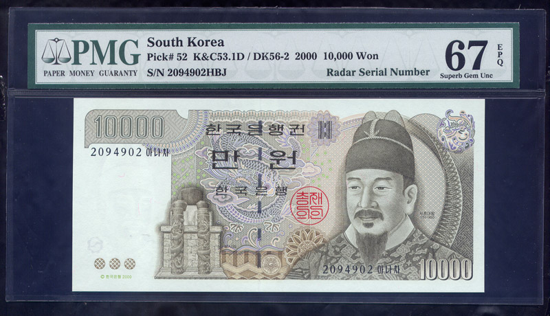 한국은행 5차 만원권 2094902 레이더 노트 PMG 67