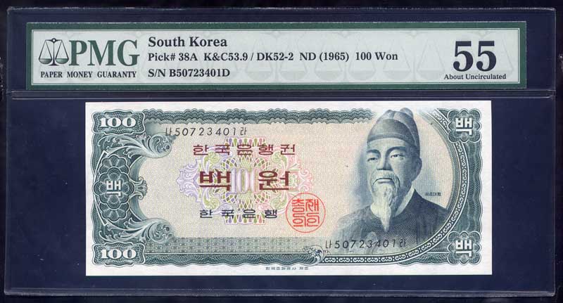 한국은행 다 100 원권 밤색중기인쇄 50포인트 PMG 55