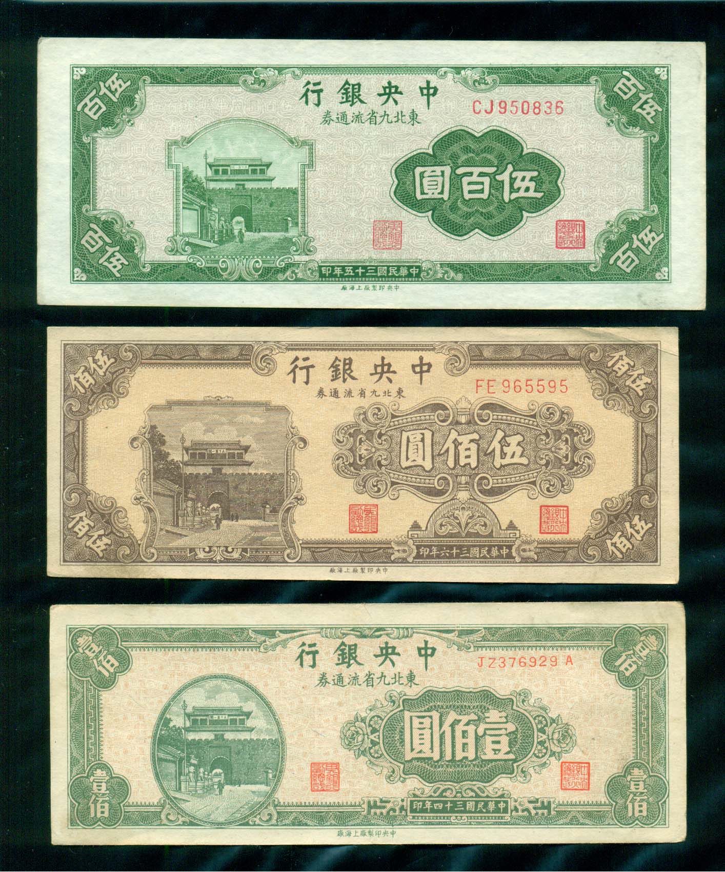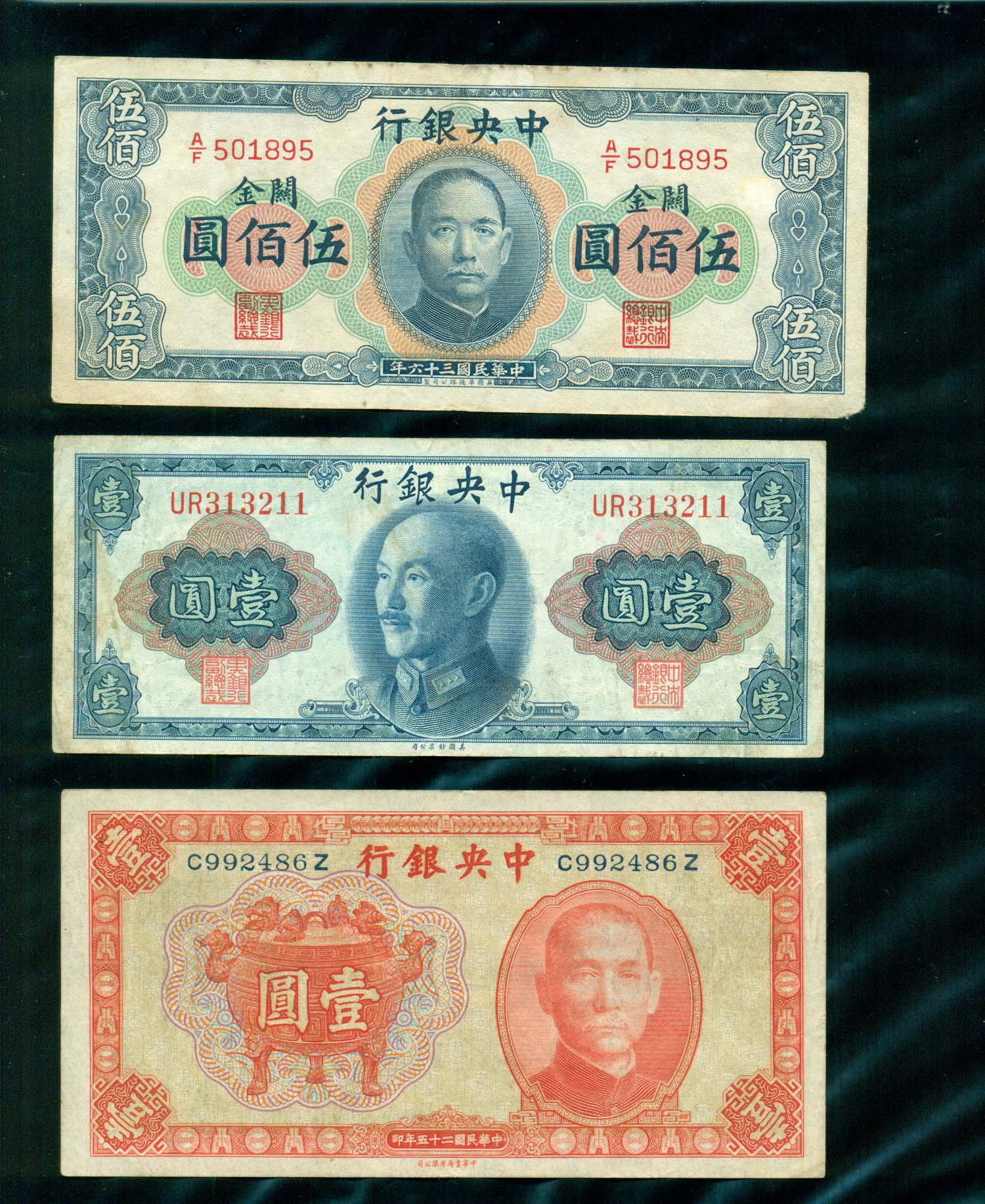 中央銀行 500,1,1원권 中華民國三十六,二十五,1945年 3장